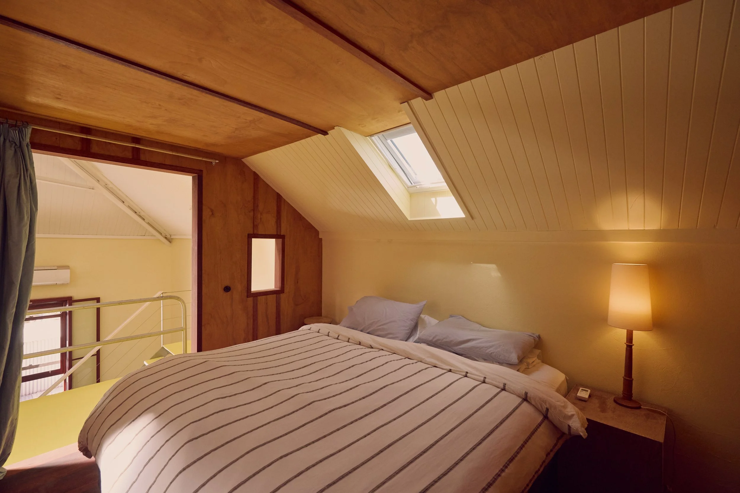 A new sleeping cabin provides a sense of enclosure plus improved thermal and acoustic performance; inspiration from ‘Le Cabanon’ by Le Corb.